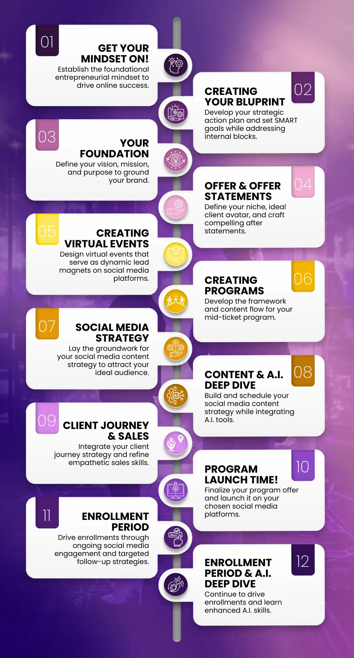 This is a hands-on, fully implementable experience designed to walk you step-by-step through launching your coaching offer in just 12 weeks.